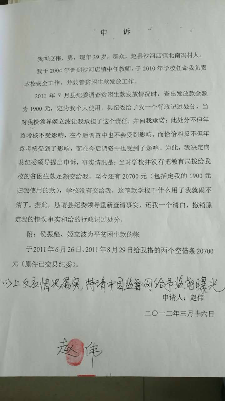 【中国监督网按语:2017年4月30日,中国监督网监督员应邀到赵伟先生处,听取了他的陈述,查阅了申诉材料,了解了有关情况。赵伟说,当时,学校违法挪用了贫困生的专用款项,他自己没有贪污一分钱,只是领导安排他自己“背黑锅”,顶替校长等受处罚,帮助学校应付纪委监察部门的查处,免得校长遭纪委监察部门处分,自己也是不得已而为之。回想起来,认为自己受冤枉。四处申诉未果,不得不求助于中国监督网予以曝光,促使有关部门查清事实,还我清白。本网监督员建议有关部门按照《中华人民共和国宪法》第41条的规定,对于赵伟的申诉,必须查清事实,负责处理。】